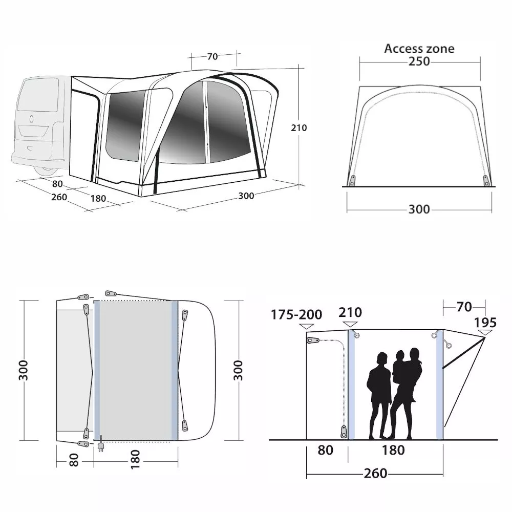 Das aufblasbare, freistehende Busvorzelt Outwell California Highway für Fahrzeuge mit einer Höhe zwischen 175 und 200 cm bietet einen kompakten, lichtdurchfluteten Wohnraum.