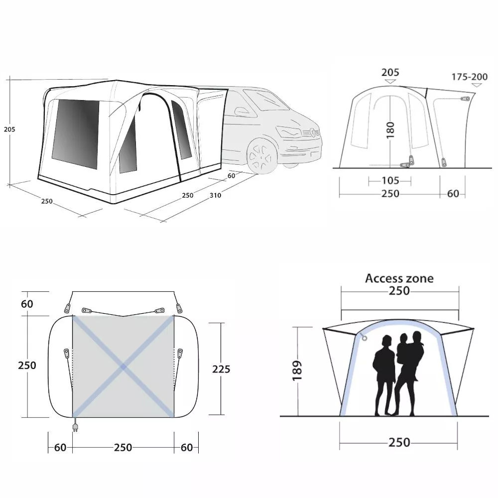 Das elegante, parallel montierte und freistehende Vorzelt Daytona Air aus der Road Trip Air Collection bietet zusätzlichen Freizeit- und Schlafplatz. Perfekt für Paare und junge Familien. Das aufblasbare und freistehende Buszelt ist geeignet für Fahrzeuge mit einer Höhe zwischen 175 und 200 cm.