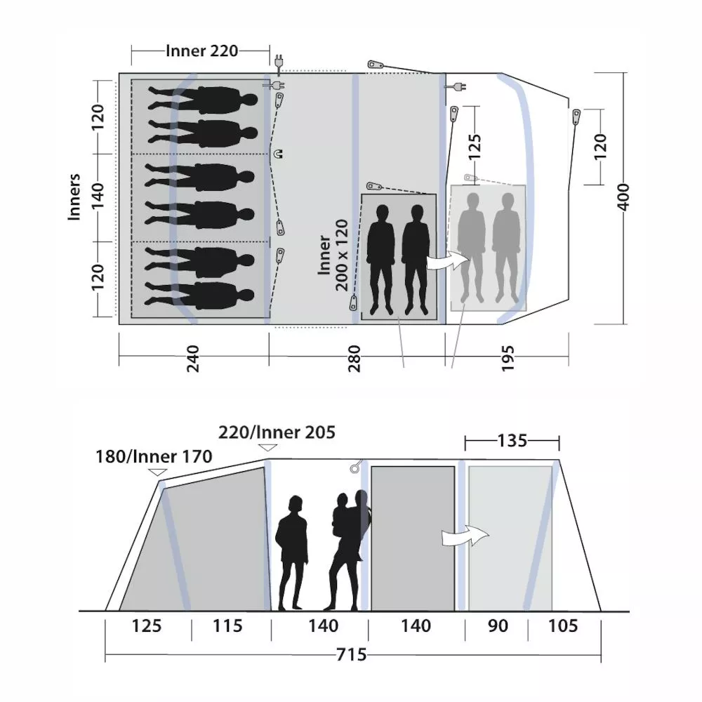 Mit einem optional einsetzbaren Innenzelt für zwei Personen, das je nach Bedarf im Wohnbereich oder in der Nasszone aufgestellt werden kann, bietet das Tunnelzelt insgesamt bis 8 Personen einen gemütlichen Schlafplatz.