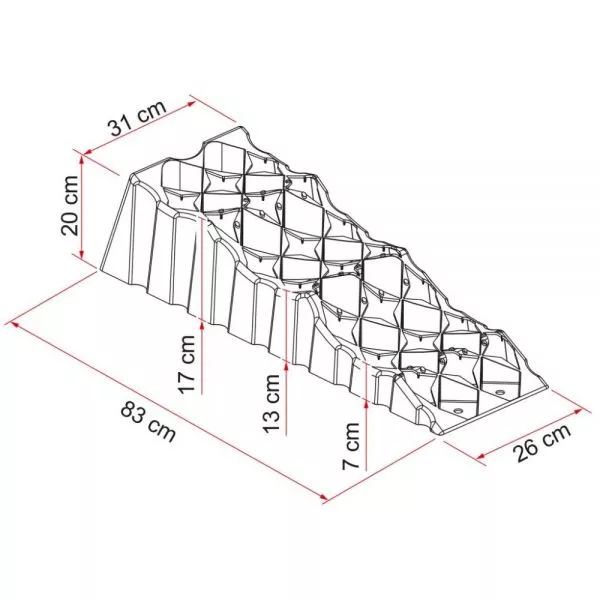 Der grosse Auffahrkeil Level Up Premium von Fiamma ist für Reisemobile und Wohnwagen bis 5 Tonnen ausgelegt. Er verfügt über drei Stufen (7/13/17 cm). Das Verhältnis der Kontaktfläche mit dem Untergrund zu der mit dem Reifen garantiert optimale Leistung auf instabilem Gelände. Die grosse Auflagefläche und die speziell geformten Stufen schützen den Reifen vor Verformung. Die Struktur ist auf eine hohe Traglast und Anpassungsfähigkeit an unebenes Gelände ausgelegt. Trotz seiner üppigeren Grösse lässt sich der Stufenkeil mit dem integrierten Handgriff an der Rückseite einfach transportieren. Das Stufenkeilsystem ist leicht und zeichnet sich durch seine hervorragende Leistung auf jedem Untergrund aus. In der mitgelieferten Tasche lassen sich die Level Up Premium aufbewahren.