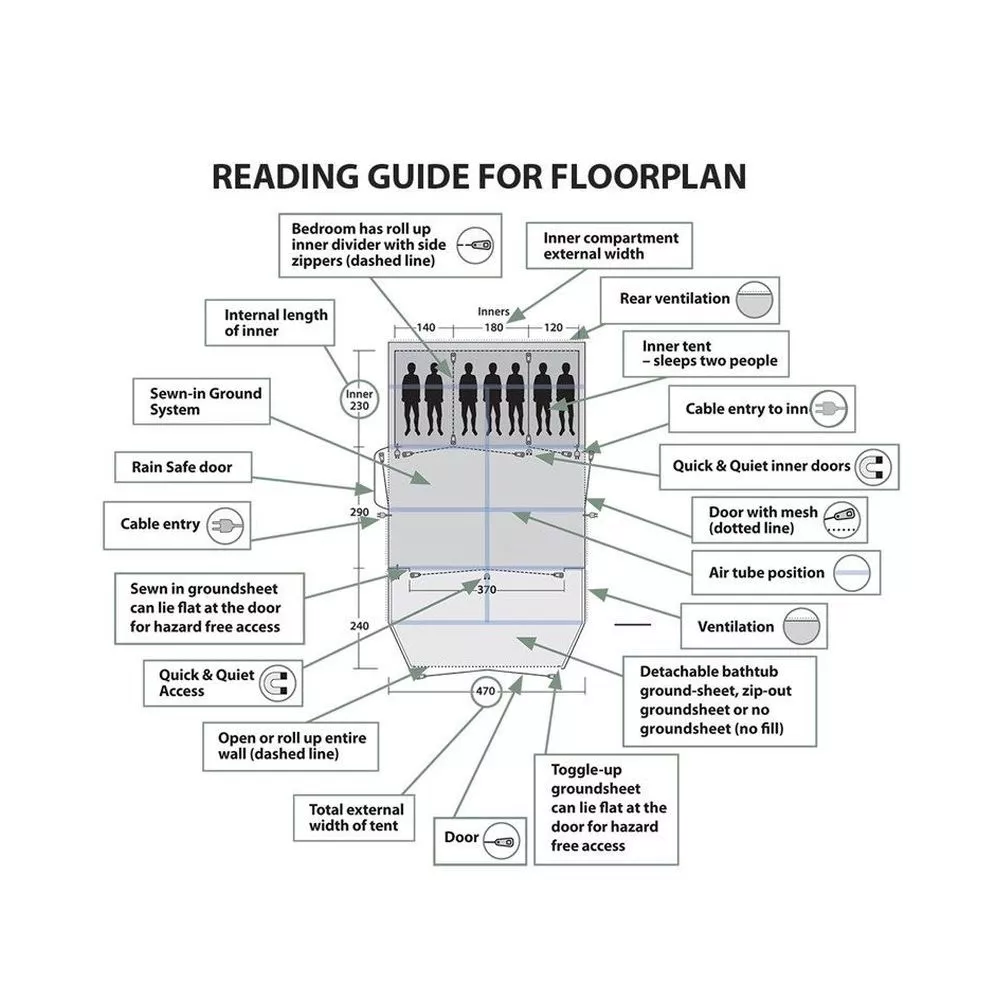 Die grosse, flach zusammenfaltbare Vordertür unter dem abgerundeten Vordach ist mit einem Moskitonetz ausgestattet. Das Vordach bietet Schutz vor Regen und dient zugleich als Sonnendach. Die vertikale Frontwand gewährleistet eine optimale Wohnraumnutzung – ideal für 2 Personen. Der herausnehmbare Zeltboden bietet Schutz gegen Zugluft, Nässe, Schmutz und hält Insekten fern. Zur Reinigung lässt sich der Wannen-Boden einfach herausnehmen und auch wieder anbringen.