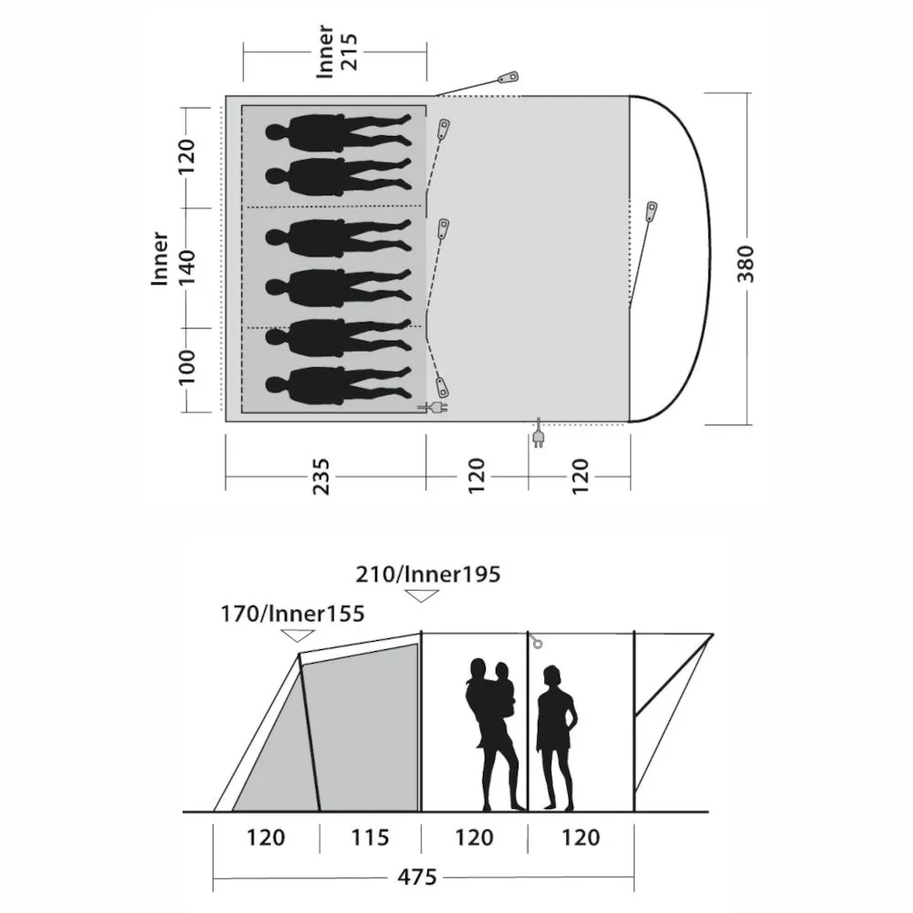 Die 2,15 Meter lange Premium-Schlafkabine hält eine Liegefläche für bis zu sechs Personen bereit. Per Reissverschluss-Trennwände kann der Schlafraum in zwei oder drei Schlafkabinen eingeteilt werden. Ideal für Familien mit Kindern und für alle, die mehr Privatsphäre wünschen. Dunkle Decken- und Seitenplanen verringern den Lichteinfall im Schlafbereich und verbessern die Schlafqualität. Für noch mehr Schlafkomfort sorgt der einstellbare Luftstrom aus Netzstoff-Lüftungsöffnungen. Unter dem Fenster befindet sich eine zusätzliche Belüftungsmöglichkeit.