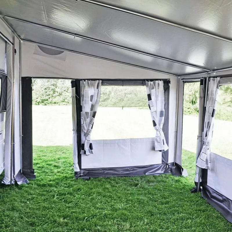 Das komplette Vorzelt ist aus reissfestem PVC-Planenstoff hergestellt und daher ideal für Ganzjahrescamping. Ein kleiner Dachüberstand von ca. 25 cm schützt die Vorderwand zusätzlich wenn es regnet. Die Vorderwand besteht insgesamt aus 2 Segmenten und kann nach Wunsch gegeneinander ausgetauscht werden. Die Eingangstür lässt sich bei Bedarf praktisch hochrollen. Die Seitenwände sind ebenso gegeneinander austauschbar. Eine verschliessbare Dauerhochentlüftung sorgt immer für perfekte Frischluftzufuhr im Vorzeltinneren. Ein Seitenteil ist mit einer grossen, seitlich einrollbaren Türe, Gaze, Klarsichtfolie und PVC-Fensterklappe, die andere Seitenwand mit einem grossen Gazefenster mit Klarsichtabdeckung ausgestattet.