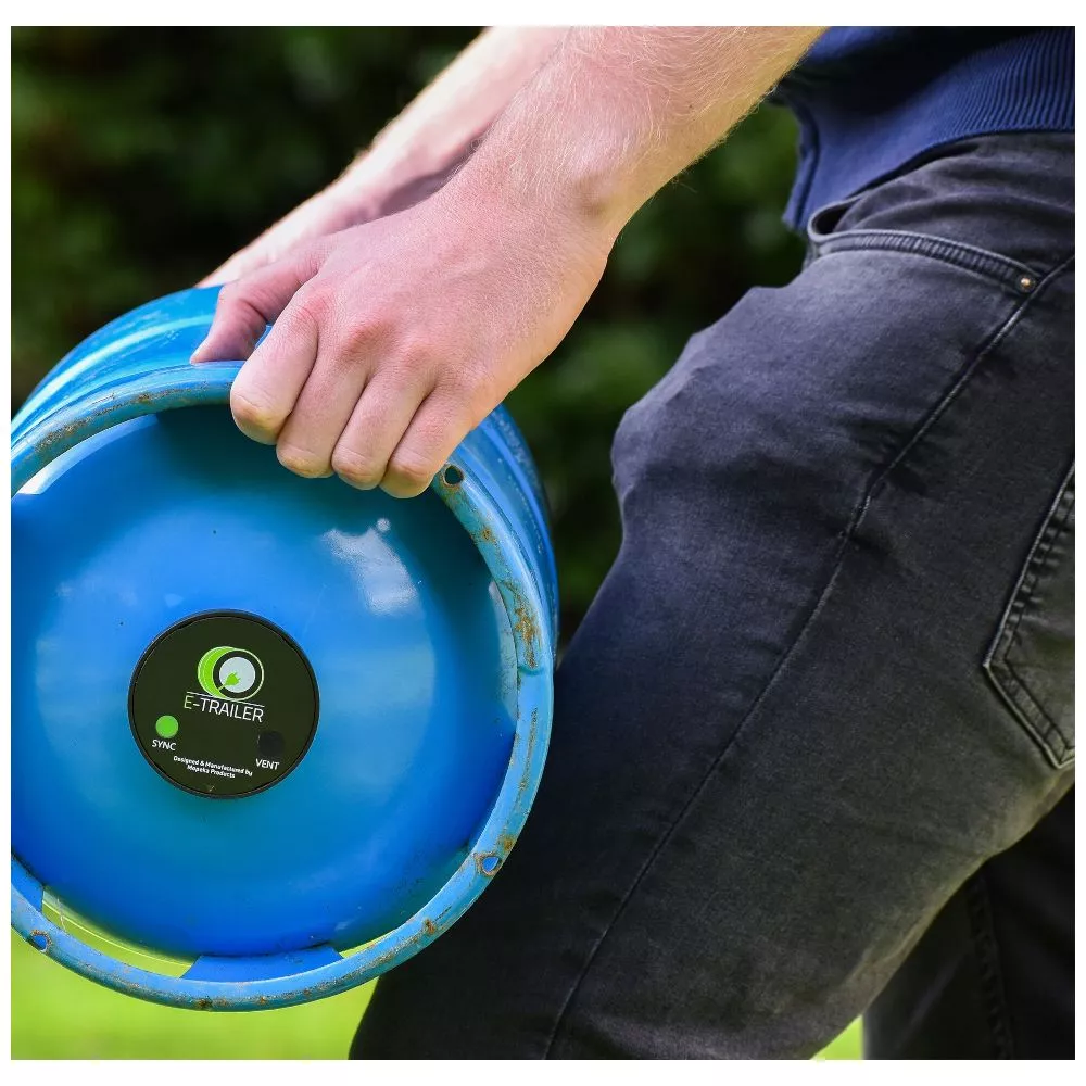 Beim E-Trailer E-Gaslevel-Modul wird ein magnetischer Sensor von aussen am Boden der Gasflasche befestigt. Für Aluminiumflaschen wird ein optional erhältlicher Adapter zur Befestigung des Sensors benötigt. An Kunststoffflaschen kann der E-Gaslevel nicht genutzt werden. Per Ultraschall misst der Sensor den Füllstand der Gasflasche und sendet die Information über die Basisstation an das Smartphone. Der Sensor lässt sich mit Hilfe der E-Trailer-App für Stahl- und Aluminiumflaschen einstellen. Auch hier kann ein Schwellenwert definiert werden, bei dem die E-Trailer-App eine Benachrichtigung sendet bevor das Gas aufgebraucht ist.