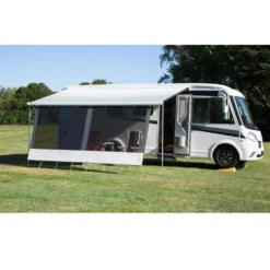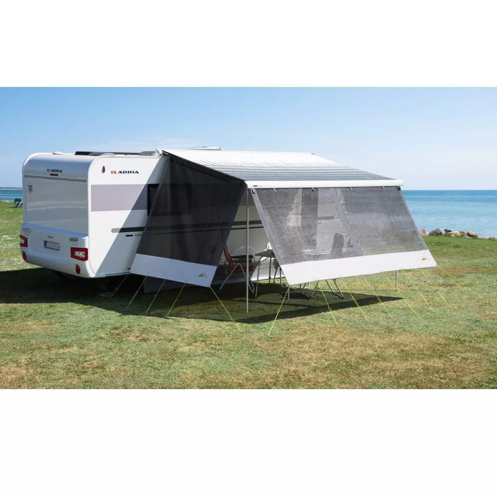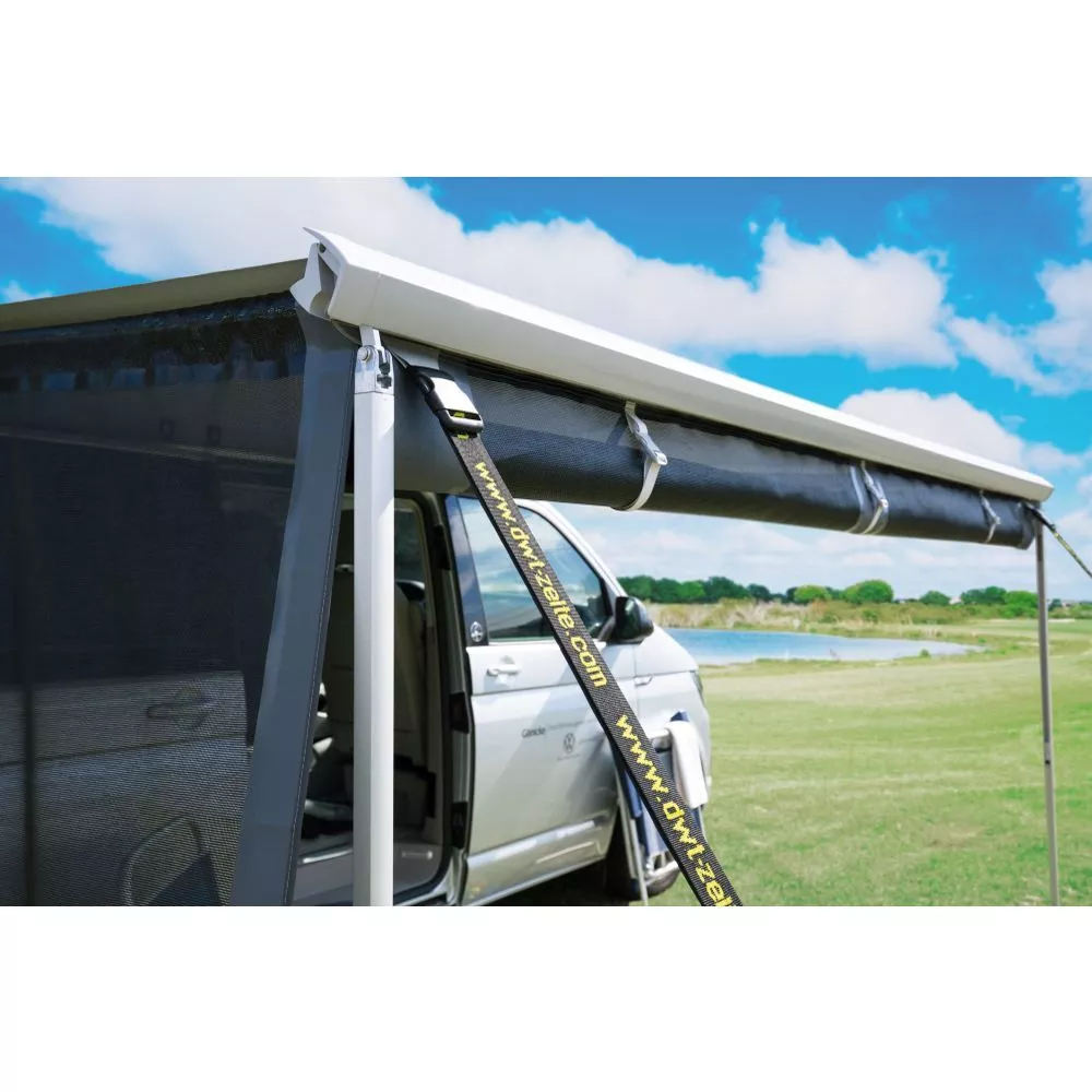Die DWT Happy Sun Vorderwand ist passend für deine Thule Omnistor und Fiamma Markise. Sie wird einfach über den Einzugskeder in der Kederschiene deiner Markise eingezogen, fertig! Die Vorderwand besteht aus leichtem Mesh-Material und dient somit als Windschutz oder Schattenspender. Es reduziert den Lichteinfall und schützt sicher und zuverlässig vor Zugluft unter deiner Markise. Am unteren Teil sind jeweils robuste Ösen befestigt, damit kannst du bei Bedarf die Vorderwand schräg stellen und erhältst so noch mehr Platz unter deiner Sonnenmarkise.