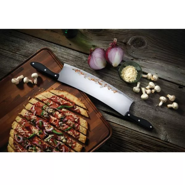 Das Napoleon Pizza-Wiegemesser zum mühelosen schneiden von Pizza und Flammkuchen, auch Ideal zum zerkleinern von Kräutern und anderen Gewürzen geeignet.
