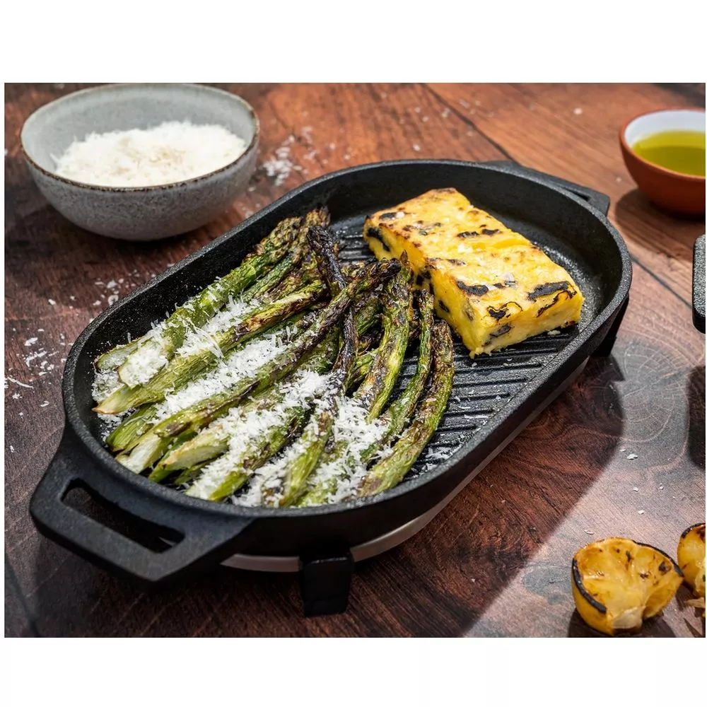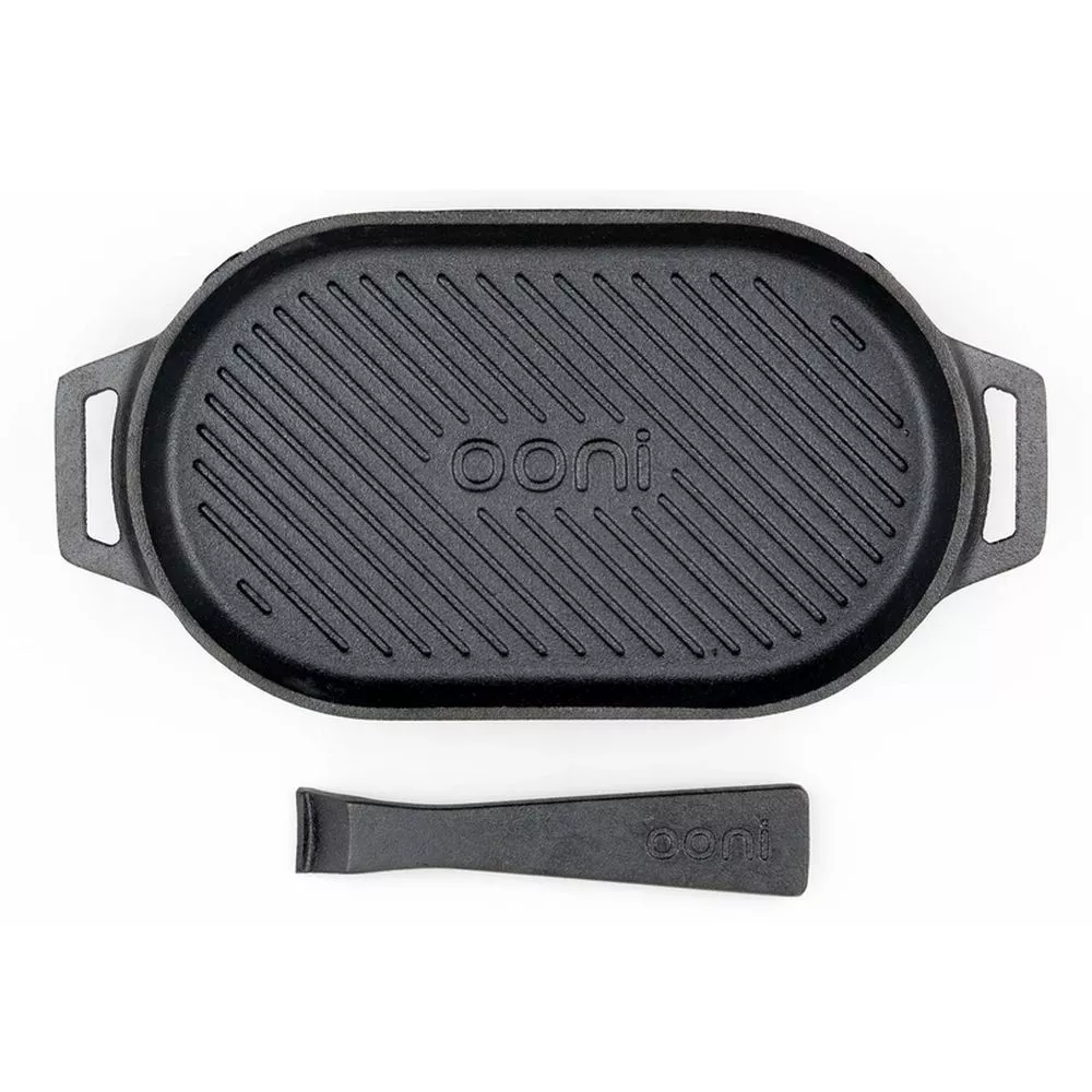 Wir präsentieren: die Ooni Grillpfanne! Diese Pfanne verbindet die Vielseitigkeit einer Servierpfanne mit den markanten Erhöhungen einer Griddlepfanne. Die Grizzler-Pfanne von Ooni hilft bei der Zubereitung köstlicher Fleisch-, Fisch- und Gemüsegerichte und hinterlässt die typischen Grillspuren auf deinen Zutaten. Wer ein Steak aus der gusseisernen Grillpfanne erst einmal probiert hat, wird nie mehr darauf verzichten wollen. Die Ooni Gusseisenpfanne hat einen abnehmbaren Griff. Dieses Zubehör wird zusammen mit einem Untersetzer aus rostfreiem Stahl geliefert.