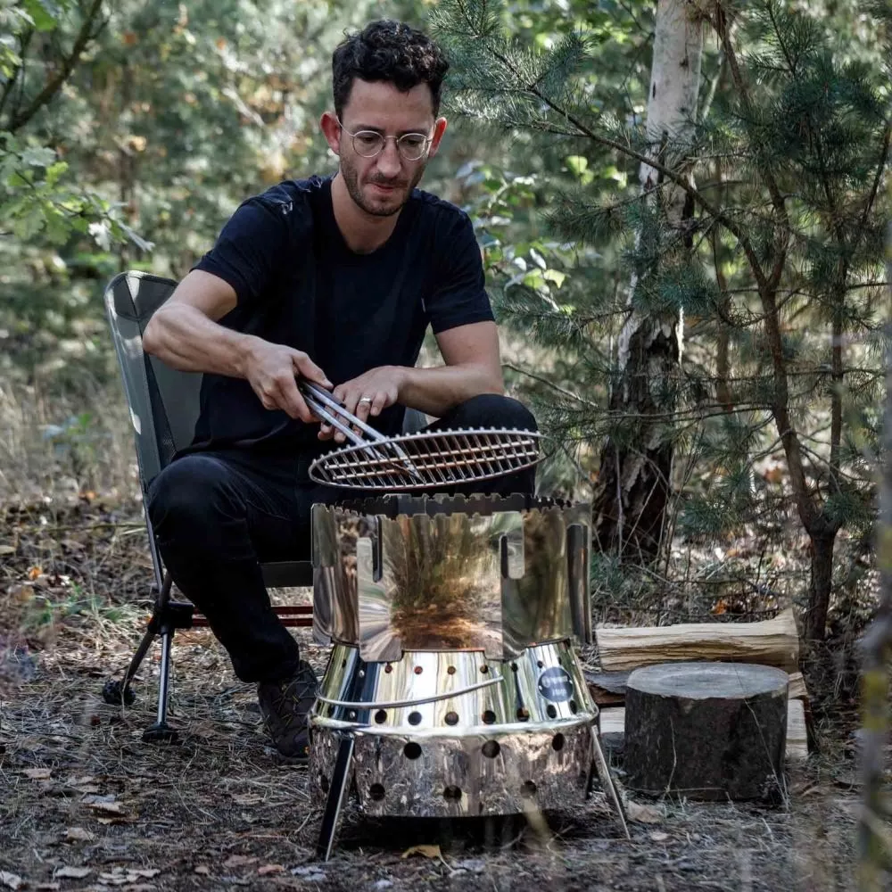 Ganz unkompliziert kannst du bis zu sechs Edelstahl-Segmente zu einem Reflektorschild am Rand des Atago-Grills zusammenfügen. So bestimmst du die Grösse selbst. Diese Segmente reflektieren die Wärme des Feuers zur Mitte, während die äussere Seite angenehm kühl bleibt. Freunde und Familie können sich entspannt neben dem Atago versammeln, geschützt vor der Hitze. Dank der Öffnung in der Mitte lassen sich Holz, Kohlen oder Briketts einfach nachlegen.