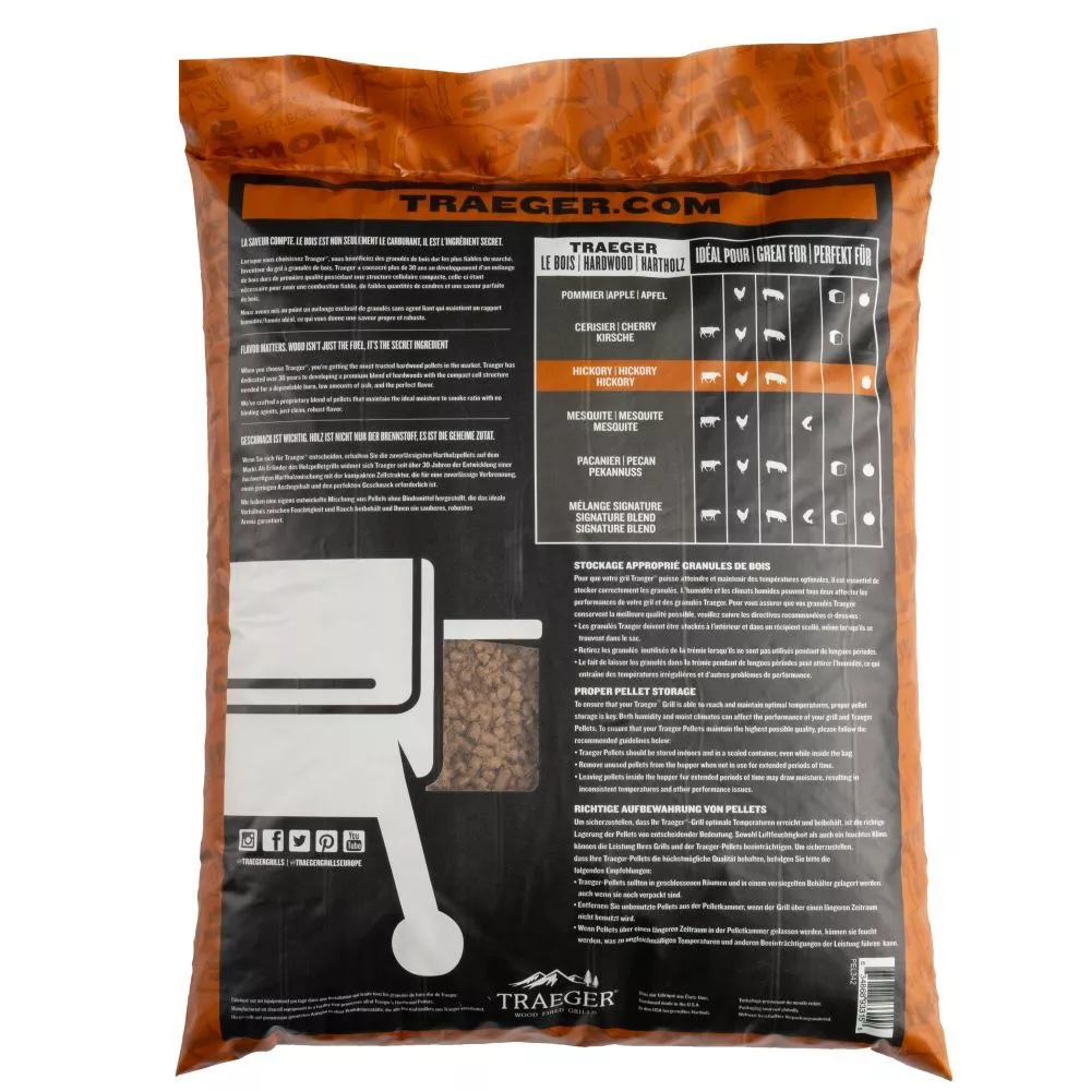Eine hochwertige, ausgewogene Mischung aus Traeger Harthölzern perfektioniert die optimale Kochtemperaturen. Sie ist dadurch schnell zu erreichen und aufrechtzuerhalten. Die Traeger Pellets mit feinem Hickory-Aroma eignen sich hervorragend für die Zubereitung von Hühnchen, Rind, Schwein, Lamm und Backwaren.