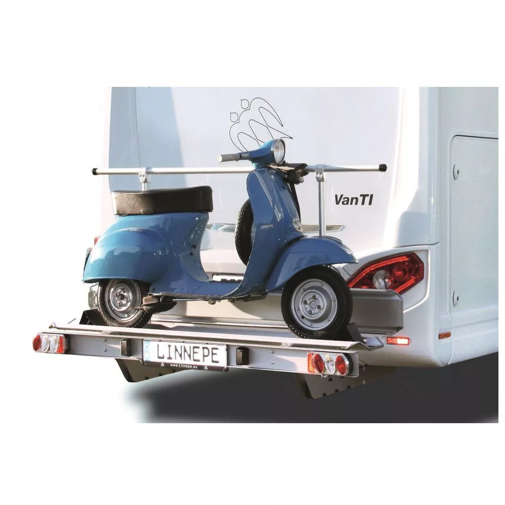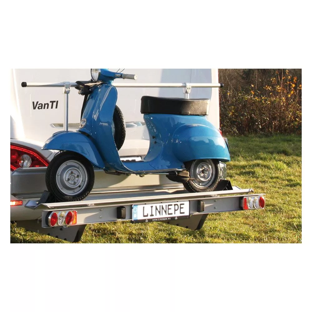 Mit dem Linnepe Findus Lastenträger sind sie auch im Campingurlaub extrem flexibel unterwegs. Lassen Sie Ihr Wohnmobil auf dem Stellplatz stehen und erkunden Sie Ihre Urlaubsumgebung mit Ihrem Roller. Umständliche Parkplatzsuche und teure Parkgebühren entfallen. Dieser leichte Aluminiumträger ist für den Transport von einem Motorroller konzipiert und stemmt ganze 150 kg.
