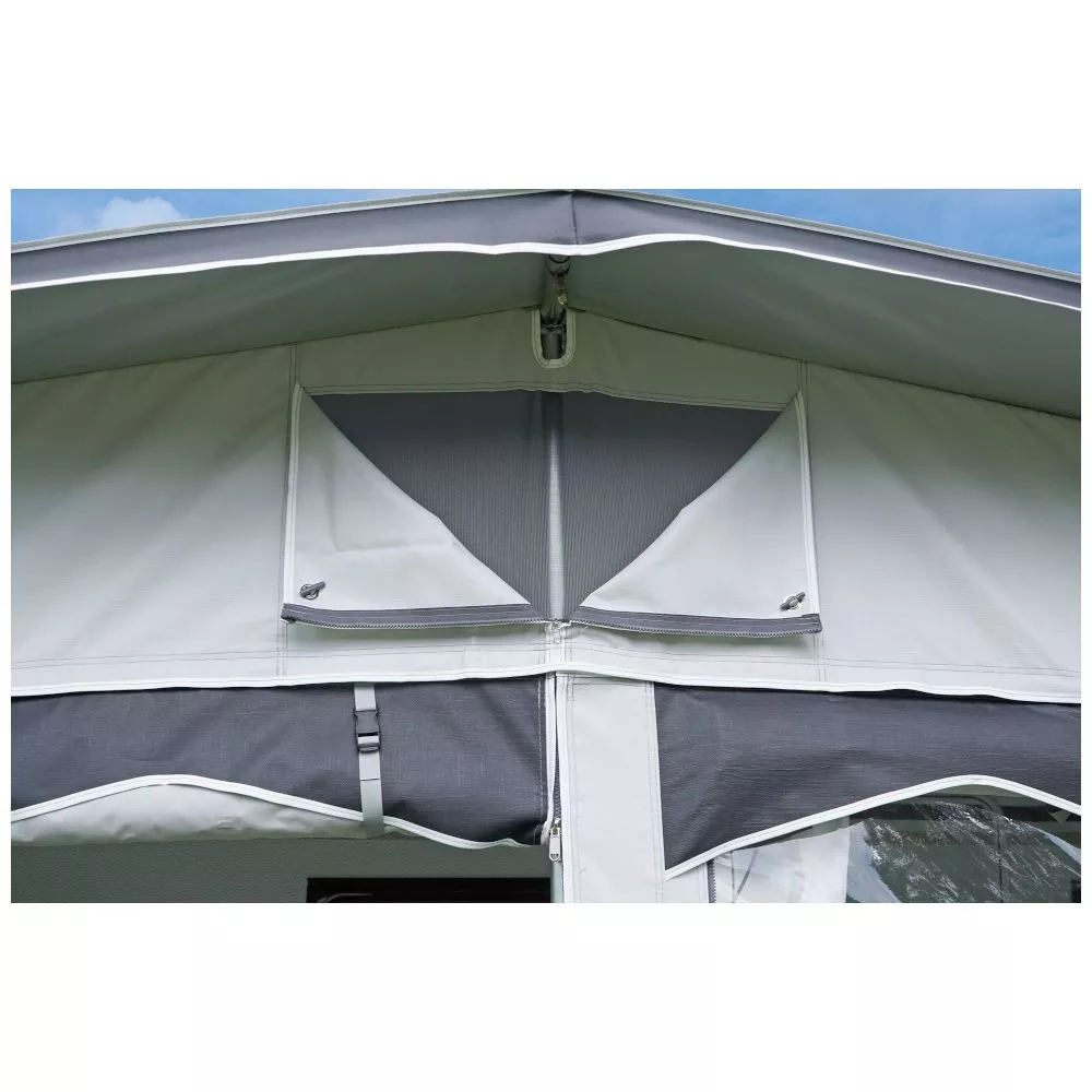 Die beiden Elemente der Vorderwand sind gegeneinander austauschbar und bei Bedarf per Reissverschluss komplett entnehmbar. Dabei ermöglicht dir die variable Vorderwand eine frei wählbare Position der hochrollbaren Eingangstür, entweder mittig oder rechts. Die Seitenwände hingegen sind identisch, jedoch ebenfalls mit einer Tür ausgestattet und vollständig abzippbar. Zudem sind in den Wandelementen grosse Fenster inklusive Gardinen, Klarsichtfolie, Moskitonetz und Blenden über den Fensterklappen verbaut. Dadurch kannst du an schönen Tagen viel Sonnenlicht ins Vorzeltinnere lassen und an regnerischen Tagen oder bei Abwesenheit einfach die Fensterklappen schliessen.