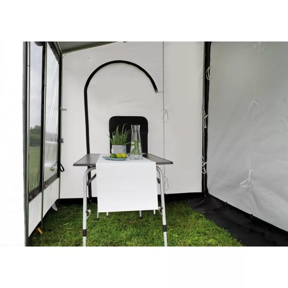 Mit einer Anschlusshöhe von bis zu 265 cm passt es ideal an Kastenwagen. Am Fahrzeug kann das INUIT Polar entweder direkt an der Markise oder über eine Schleuse befestigt werden. Alternativ kann es aber auch freistehend aufgestellt werden. Dank der beiden gegenüberliegenden Seiteneingänge gelangst du schnell und einfach in dein Vorzelt. Die Front ist mit getönten Fenstern und einem Air Vent Fenster ausgestattet, wodurch dir ein schöner Panoramablick in die Natur geboten wird.