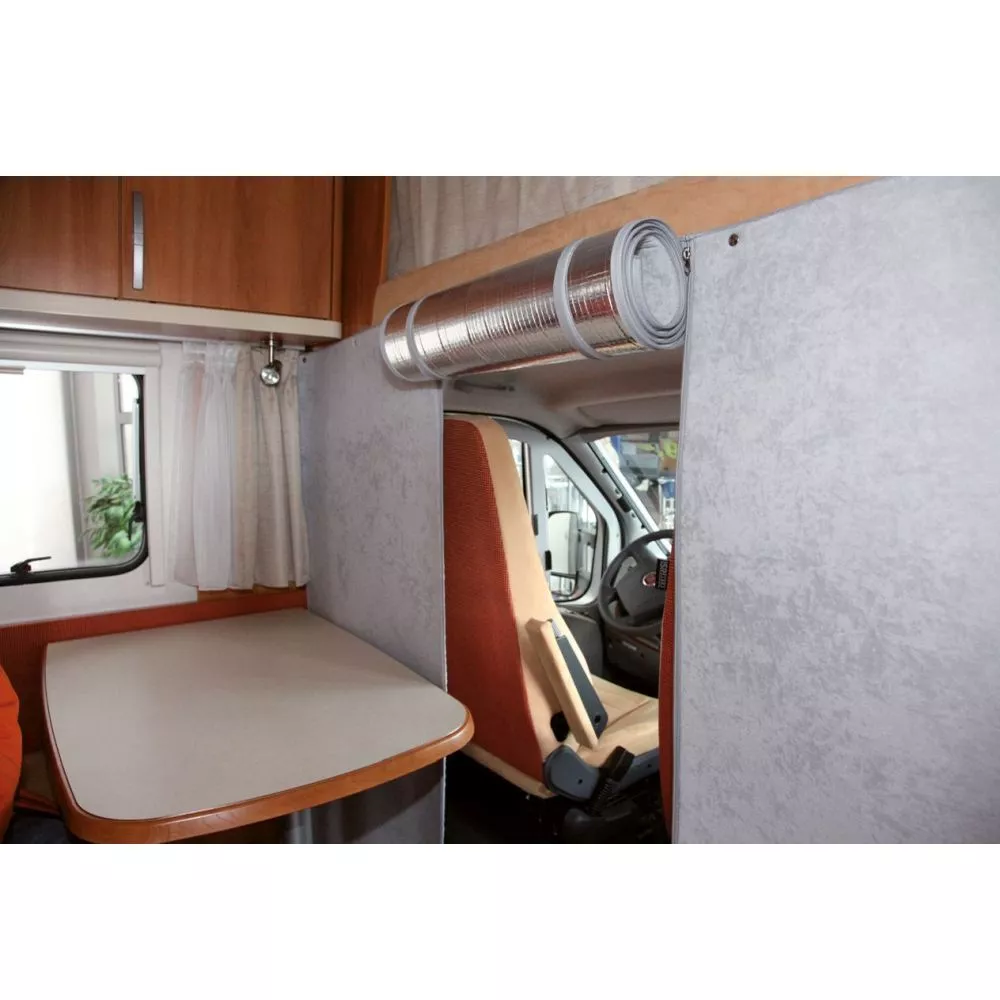 Der Hindermann Thermo-Trennvorhang für Wohnmobile mit Alkoven besteht aus einem 3-lagigen, ca. 8 mm starken Iso-Sandwichmaterial (Oberware 100% Polyester, Unterware 100% Polyurethan). Der Thermovorhang bietet optimalen Kälteschutz und isoliert die Wärme zwischen Fahrerhaus und Wohnbereich. Die Befestigung erfolgt mittels 10 Druckknöpfen. Für bequemen Durchstieg kann das Mittelteil des Trennvorhangs mit zwei Reissverschlüssen geöffnet und einfach aufgerollt werden. Für eine angenehme Atmosphäre ist der Vorhang zum Innenraum hin mit einem freundlich grauen Polyestervelours beschichtet. Die Aussenschicht besteht aus einer reflektierenden, alubedampften Polyesterfolie. Universell passend für viele Alkoven-Fahrzeuge – ein möglicherweise überstehender Rand kann entweder eingeschlagen oder von Hand zugeschnitten werden.