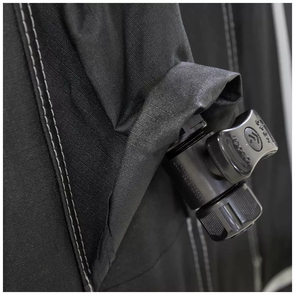 Dank dem eingebauten innovativen Einpunkt-Aufblassystem ist das Tour Vorzelt in wenigen Minuten komplett aufgepumpt. Dafür muss die mitgelieferte Pumpe an nur einem einzigen Aufblaspunkt angeschlossen werden und schon füllen sich Luftschläuche gleichmässig mit Luft – Kein lästiges Nachpumpen oder Umstecken, denn alle Luftschläuche sind miteinander verbunden. Bei Bedarf können die Verbindungsventile zwischen den Luftschläuchen jederzeit geschlossen werden.
