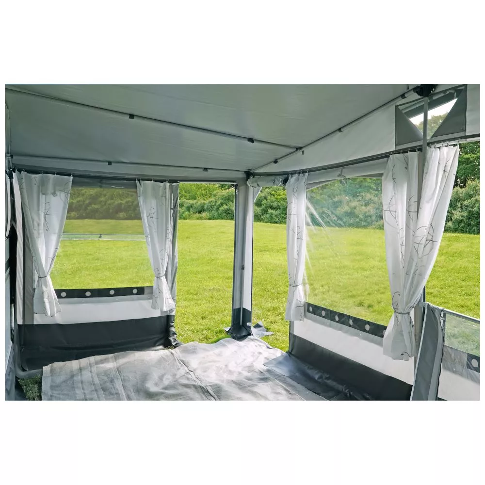 Grosse Fenster an allen Wandelementen sorgen für viel Tageslicht im Wohnraum. Die zweiteilige, gegeneinander austauschbare Vorderwand ermöglicht eine freie Wahl der Türposition, entweder mittig oder rechts am Vorzelt. Die beiden Seitenwände sind jeweils mit einem Fenster und seitlich wegrollbarer Tür ausgestattet. Dadurch kannst du je nach Stellplatz und Einrichtung des Wohnbereichs frei entscheiden, welchen Vorzelteingang du nutzen möchtest. Zudem bieten dir die 3 Eingänge auf beengten Stellplätzen viele Vorteile.