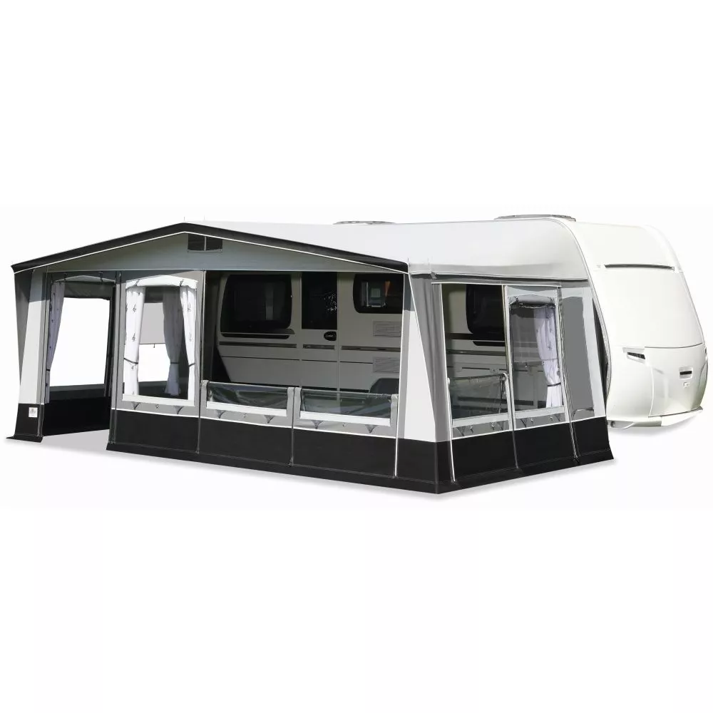 Beim grossen Premium-Plus-Vorzelt brand Palazzo 300 kommt für das Dach und die Seitenwände ein robustes PVC-Material zum Einsatz. Die Vorderwand wird aus atmungsaktivem Ten Cate – Gewebe gefertigt. Verschliessbare Fensterklappen, Erdstreifen aussen und innen, Wetterschutzabdeckung der Reissverschlüsse, 3-fach-Seitenfenster, Gardinen und ein robustes 32 mm Stahlrohrgestänge und Vordachverstärkung vervollständigen die umfangreiche Serienausstattung. Das Design ist elegant und zeitlos. Ein ideales Wohnwagenvorzelt für alle Ganzjahrescamper.
